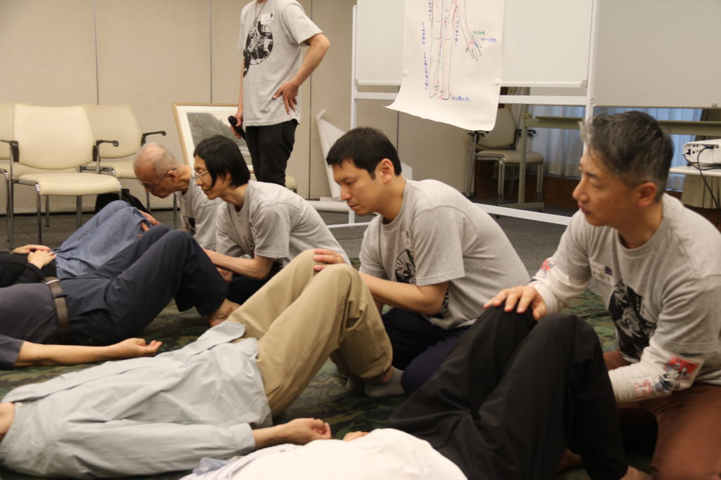 「足趾の操法」前に膝窩ひかがみの触診をする実行委員。